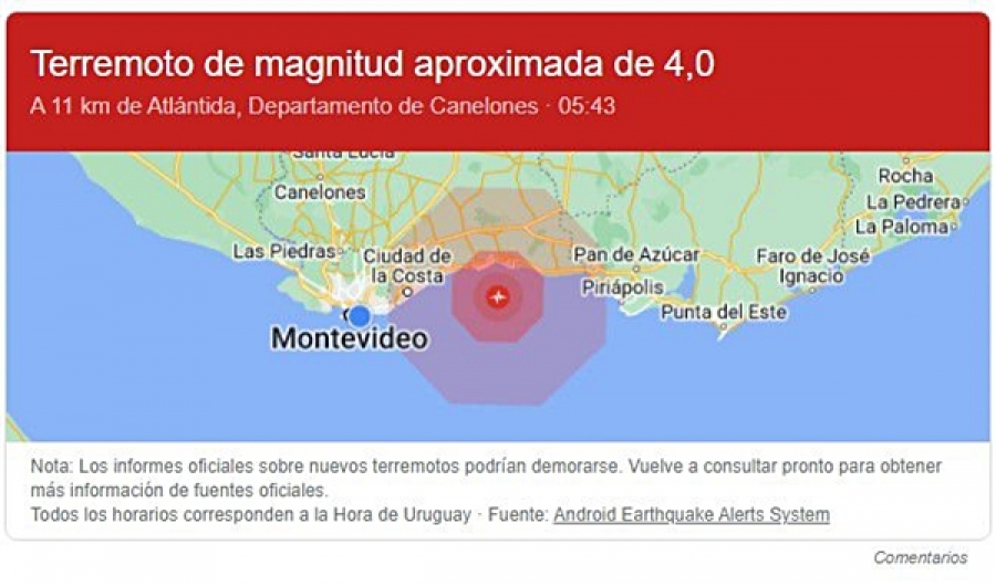 La plataforma Google informa que sobre las 5:43 hubo un “terremoto de magnitud aproximada 4,0” basado en el sistema Android Eartquake Alerts System. Asimismo, el motor de búsqueda añade que esto se produjo a 11 km de Atlántida.
