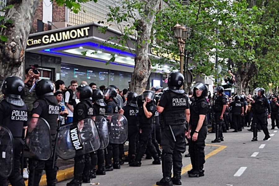 Pasadas las 18 horas, en el centro de Buenos Aires, cuando en las puertas del cine Gaumont se desarrollaba una conferencia de prensa seguida por centenares de personas de forma pacífica, la Policía de la Ciudad empezó a desplazar violentamente a los manifestantes, periodistas y reporteres gráficos que cubrían el evento. En el lugar no se había producido ningún disturbio, y al llegar las fuerzas policiales la gente reunida se limitó a dedicarle cánticos; pero claramente la orden era "limpiar" el lugar, lo que quedó de manifiesto ante la violencia con la que los efectivos primero intentaron hacer subir a la gente -artistas, trabajadores, estudiantes, cinéfilos de toda edad- a las veredas, y luego en el modo en que empezaron a agredir físicamente, con golpes de escudo, empellones y trompadas lanzadas aleatoriamente y con saña.
